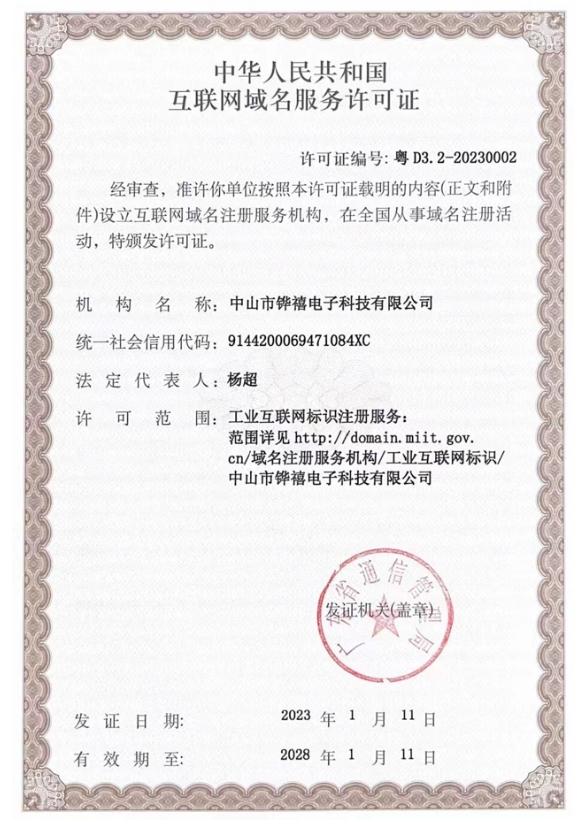 中山市鏵禧電子科技有限公司作為中山市唯一一家工業(yè)互聯(lián)網(wǎng)標(biāo)識注冊服務(wù)機(jī)構(gòu)參與本次論壇并被公開授予許可證。