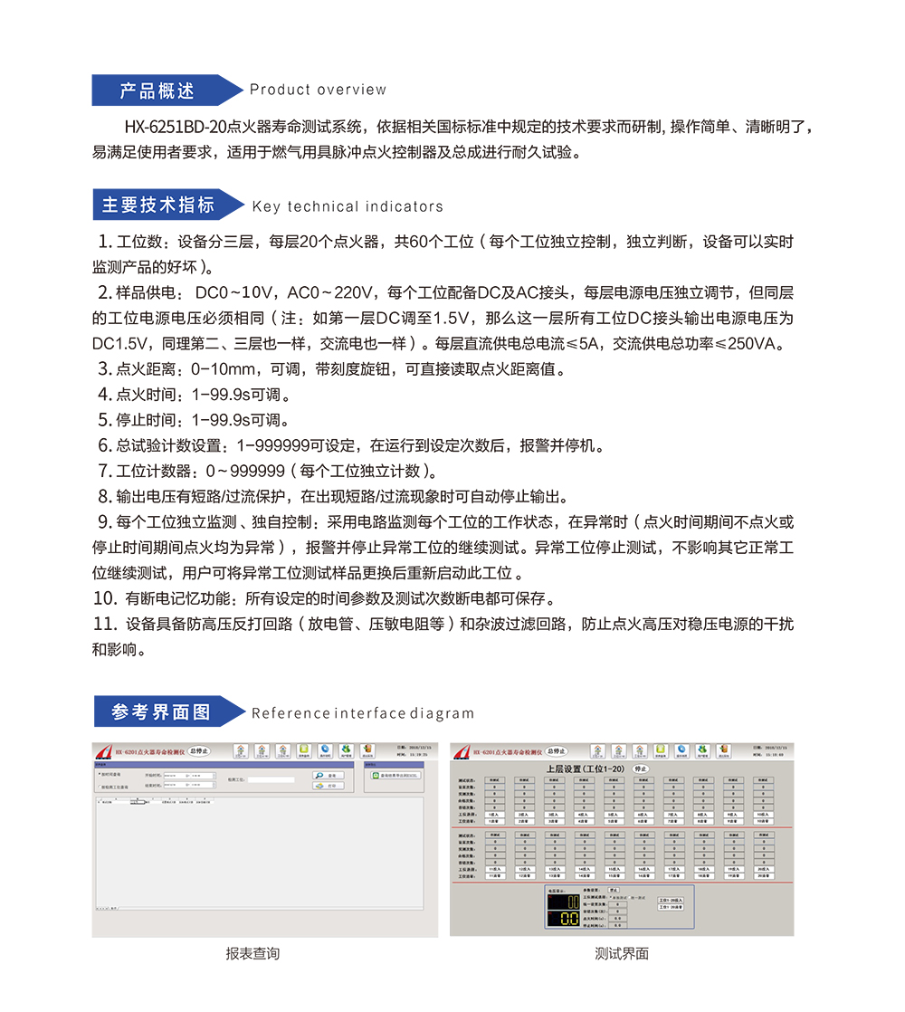 HX-6251BD-20點火器壽命測試系統,依據相關國標標準中規定的技術要求而研制,操作簡單、清晰明了易滿足使用者要求,適用于燃氣用具脈沖點火控制器及總成進行耐久試驗。