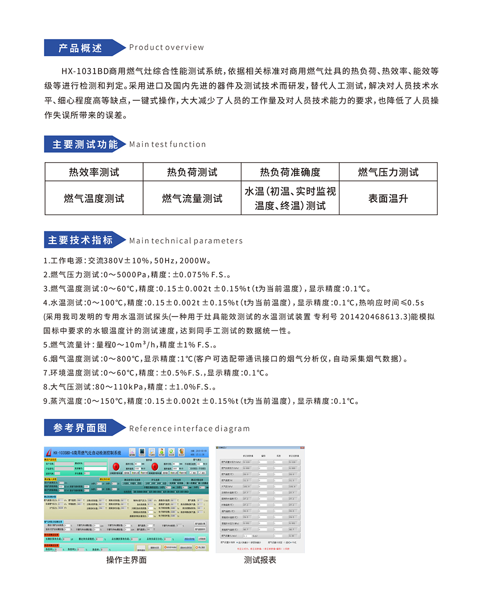 HX-1031BD商用燃氣灶綜合性能測試系統,依據相關標準對商用燃氣灶具的熱負荷、熱效率、能效等級等進行檢測和判定。采用進口及國內先進的器件及測試技術而研發,替代人工測試,解決對人員技術水平、細心程度高等缺點,一鍵式操作,大大減少了人員的工作量及對人員技術能力的要求,也降低了人員操作失誤所帶來的誤差。