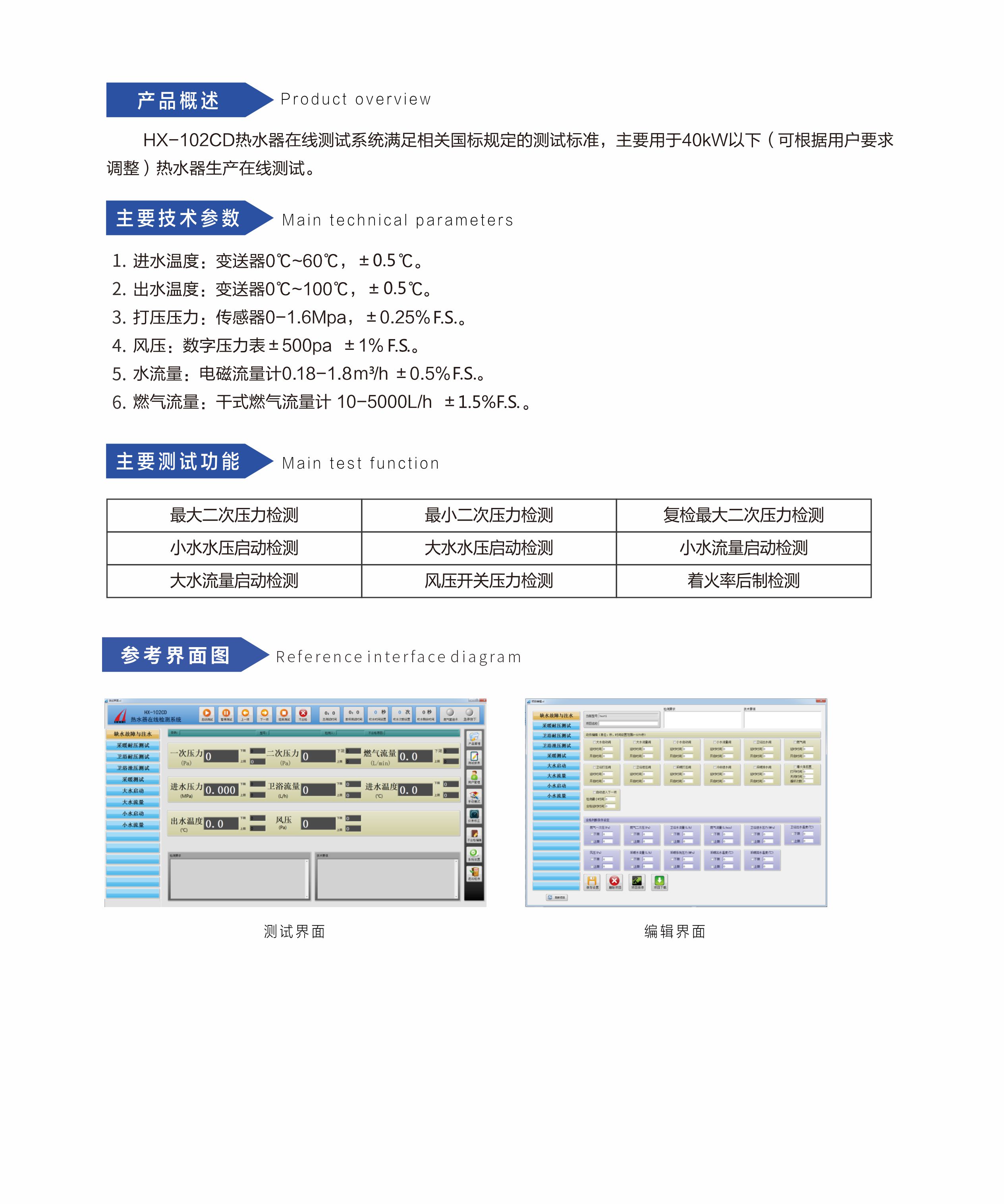 HX-102CD熱水器在線測試系統(tǒng)滿足相關(guān)國標(biāo)規(guī)定的測試標(biāo)準(zhǔn),主要用于40kW以下(可根據(jù)用戶要求調(diào)整)熱水器生產(chǎn)在線測試。