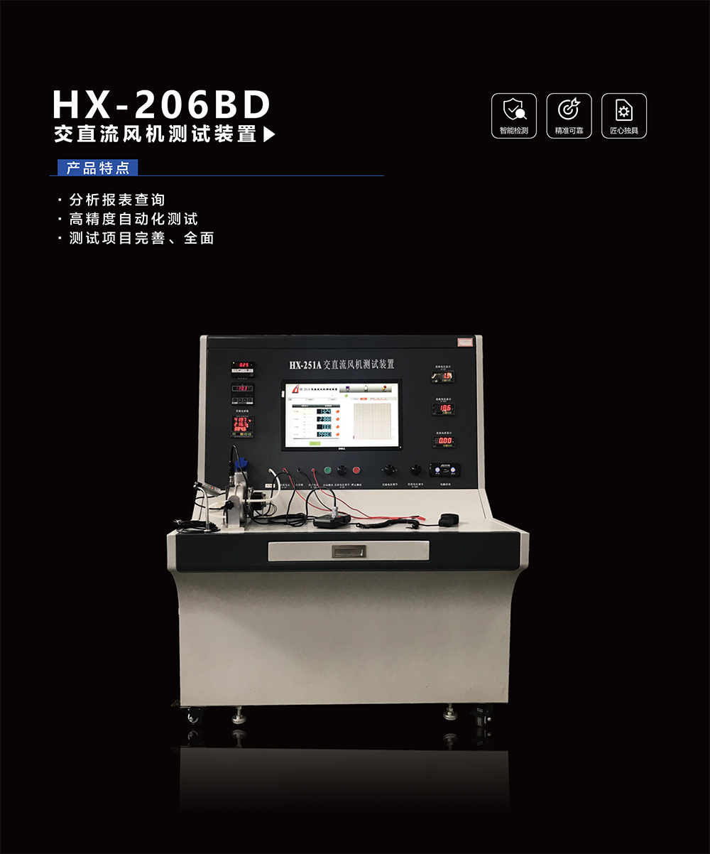 HX-206BD交直流風機測試裝置采用工控電腦、數據采集卡、PLC完成對各項數據的采集、顯示及監控,適用于各種型號的交流風機、直流無刷風機進行性能測試。設備配件高效可靠、能適應連續工作。
