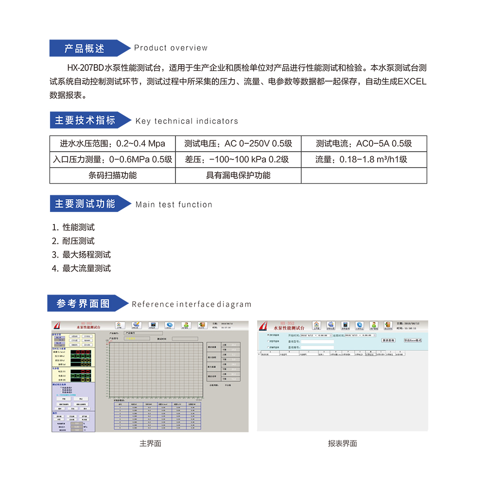 HX-207BD水泵性能測試臺(tái),適用于生產(chǎn)企業(yè)和質(zhì)檢單位對(duì)產(chǎn)品進(jìn)行性能測試和檢驗(yàn)。本水泵測試臺(tái)測試系統(tǒng)自動(dòng)控制測試環(huán)節(jié),測試過程中所采集的壓力、流量、電參數(shù)等數(shù)據(jù)都一起保存,自動(dòng)生成EXCEL數(shù)據(jù)報(bào)表。